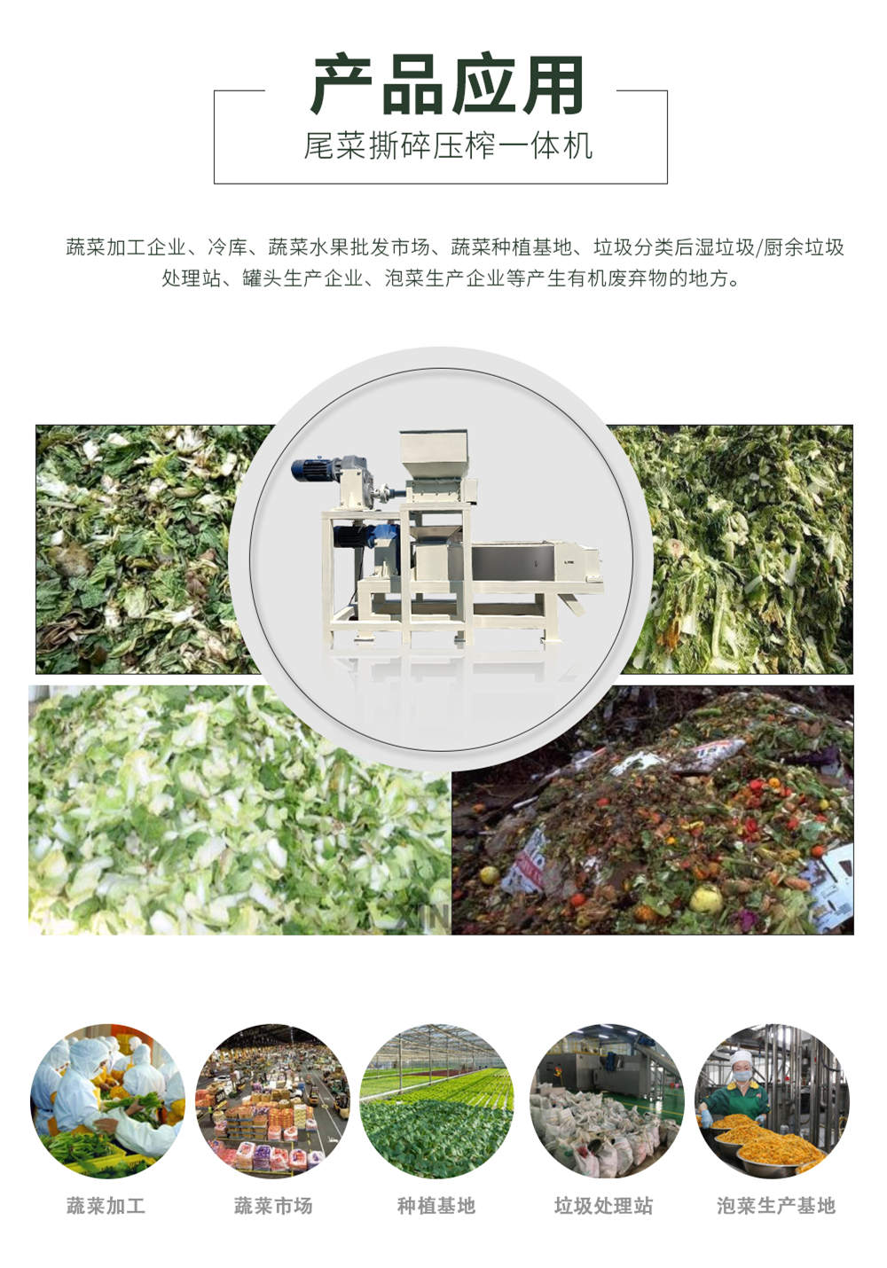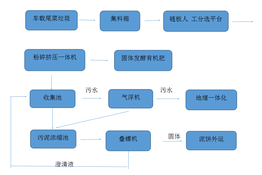 尾菜來料后進(jìn)入集料箱緩存,然后經(jīng)底部螺旋輸送至鏈板平臺(tái);鏈板輸送機(jī)設(shè)計(jì)為“Z”型,后端作為人工分選平臺(tái),中間設(shè)備自動(dòng)除鐵器,去除尾菜垃圾中的鐵制品;經(jīng)過分選的尾菜垃圾隨后進(jìn)入粉碎擠壓一體機(jī)進(jìn)行減量。經(jīng)過擠壓后的固體垃圾進(jìn)入發(fā)酵倉進(jìn)行發(fā)酵,用作有機(jī)肥;液體進(jìn)入收集池中緩存。收集池中的液體隨后泵入氣浮機(jī),去除大量懸浮物,氣浮后的浮渣進(jìn)入疊螺機(jī),污水則進(jìn)入地埋一體化設(shè)備,*后達(dá)標(biāo)排放。