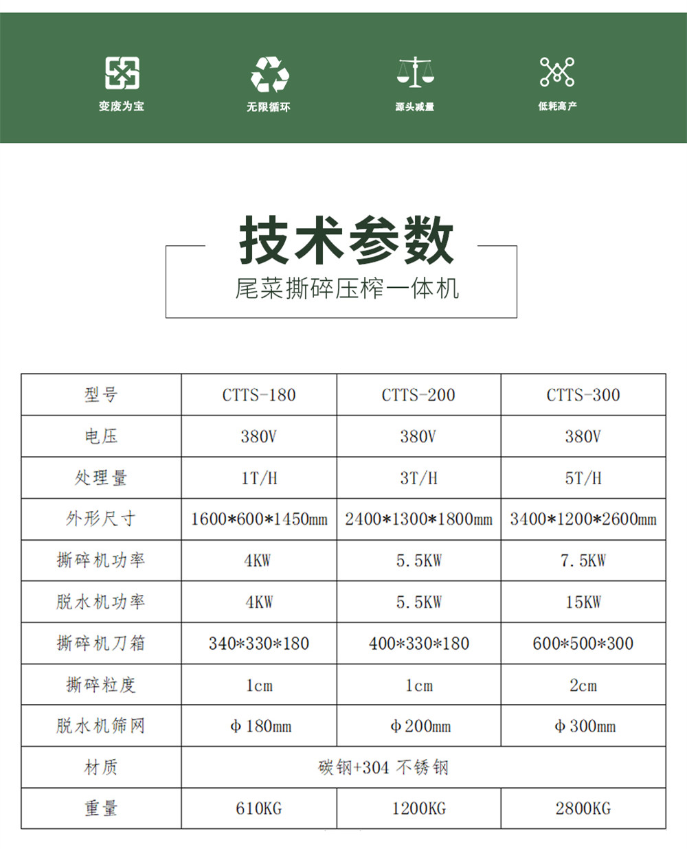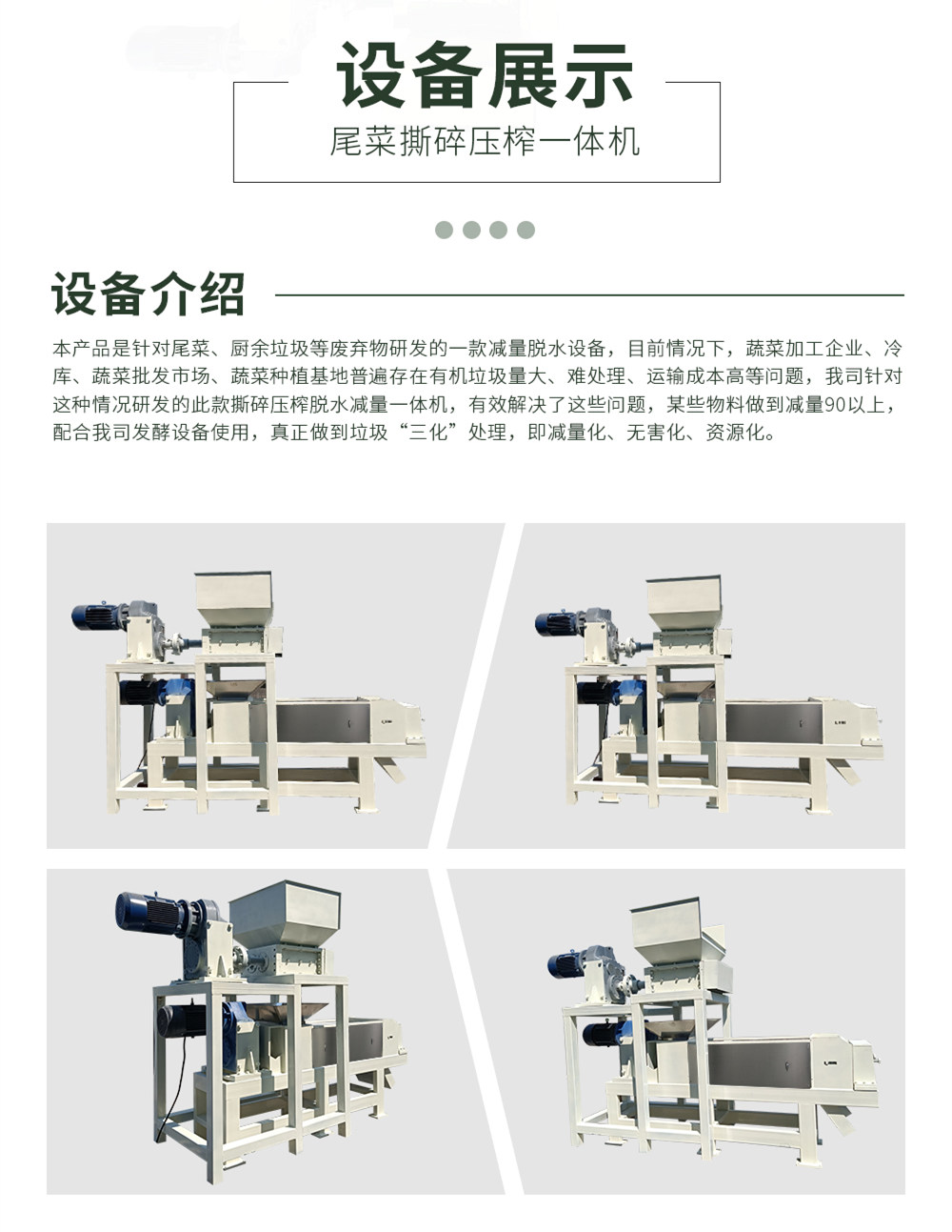 尾菜來料后進(jìn)入集料箱緩存,然后經(jīng)底部螺旋輸送至鏈板平臺(tái);鏈板輸送機(jī)設(shè)計(jì)為“Z”型,后端作為人工分選平臺(tái),中間設(shè)備自動(dòng)除鐵器,去除尾菜垃圾中的鐵制品;經(jīng)過分選的尾菜垃圾隨后進(jìn)入粉碎擠壓一體機(jī)進(jìn)行減量。經(jīng)過擠壓后的固體垃圾進(jìn)入發(fā)酵倉進(jìn)行發(fā)酵,用作有機(jī)肥;液體進(jìn)入收集池中緩存。收集池中的液體隨后泵入氣浮機(jī),去除大量懸浮物,氣浮后的浮渣進(jìn)入疊螺機(jī),污水則進(jìn)入地埋一體化設(shè)備,*后達(dá)標(biāo)排放。